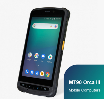 MT90 Orca III, razvit za hitro in učinkovito skeniranje črtne kode, zagotavlja največjo produktivnost. Njegov mehanizem za skeniranje megapikslov je vgrajen na vrhu naprave in ga je mogoče sprožiti z navideznim gumbom na zaslonu ali fizičnim gumbom ob strani dvojke za enostavno iskanje po točkah.